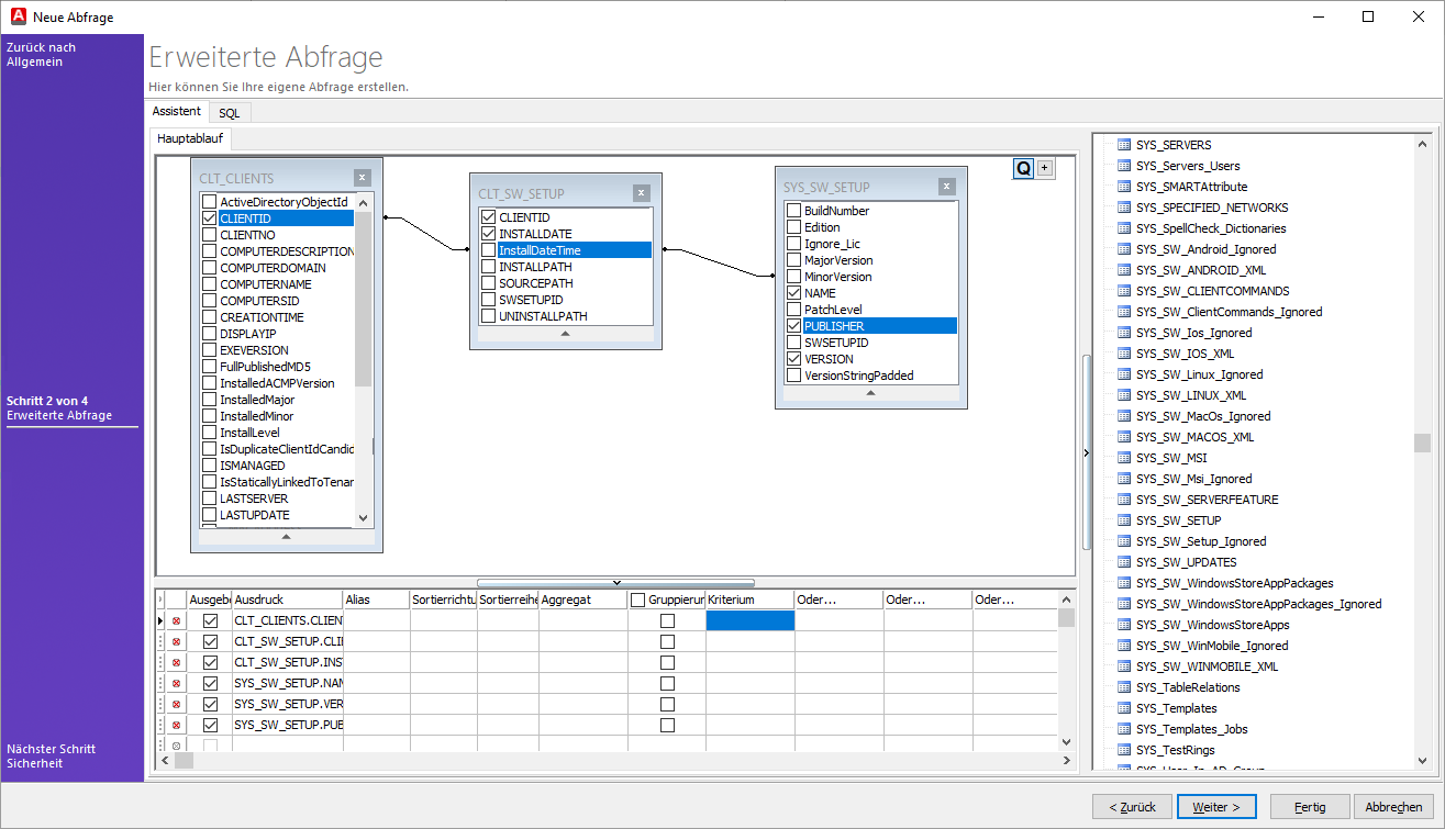 Auf der rechten Seite finden Sie die Datenbanktabellen, die Sie miteinander verknüpfen können, indem Sie die passenden Tabellen in das mittlere Feld (der Hauptablauf des Assistenten) per Drag-and-Drop hineinziehen. Die ausgewählten Felder werden Ihnen im unteren Fenster angezeigt, sowie die folgenden Tabellenfelder, aus denen Sie zusätzliche Informationen ziehen können: Ausdruck, Alias, Sortierrichtung, Aggregat, Gruppierung oder Kriterium.