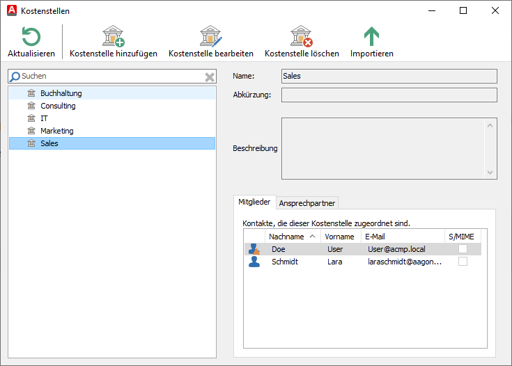 | Cost Centers can be assigned to a department, which can then be used to charge for costs and services within the company. You can also directly enter the employees and contact persons belonging to a specific cost center. | |