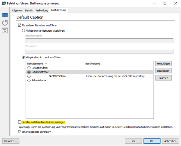 Damit dann das AutoMATE aber wieder die Fenster sieht und findet stellt man einfach ein das diese als Benutzer ausgeführt werden. Hierbei werden dann die entsprechenden Aktionen auf dem grade angemeldeten User Desktop ausgeführt mit den Berechtigungen die unter dem Tab "Ausführen als" eingetragen sind.