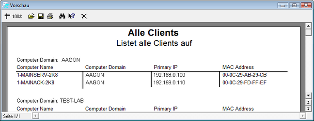 Durch diese Konfiguration wird über jeder Gruppe der Domainname angezeigt. Direkt darunter befinden sich die Beschriftungen der einzelnen Spalten. Unterhalb dieses Bereichs sind alle Clients aufgelistet, welche der genannten Domain angehören. Die Vorschau zeigt das Ergebnis: