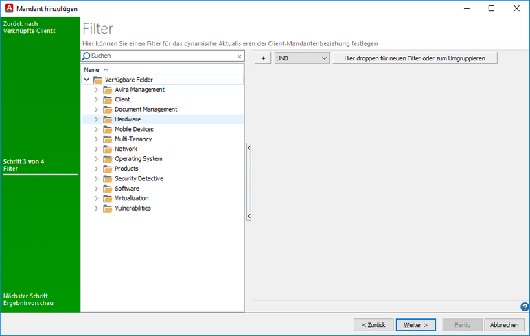 Für die Filteroptionen lesen Sie im untergeordneten Kapitel: Filteroptionen. Nachdem Sie Ihren Filter eingestellt haben, klicken Sie auf Weiter. Ihnen wird nun eine Vorschau der Clients angezeigt, die dem Filter entsprechen. Zusätzlich zum Computernamen wird Ihnen angezeigt, ob die Verknüpfung möglich ist. Wenn die Verknüpfung nicht möglich ist, wird Ihnen in der Spalte Verknüpfungsstatus der Grund angezeigt.