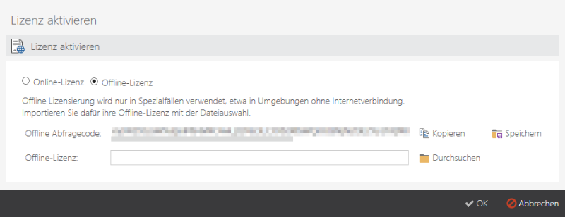 In Umgebungen ohne eine aktive Internetverbindung ist es möglich, eine Offline-Lizenz zu nutzen. Dafür benötigen Sie einen Offline-Abfragecode und müssen die Offline-Lizenz aus Ihrem Dateiverzeichnis importieren.